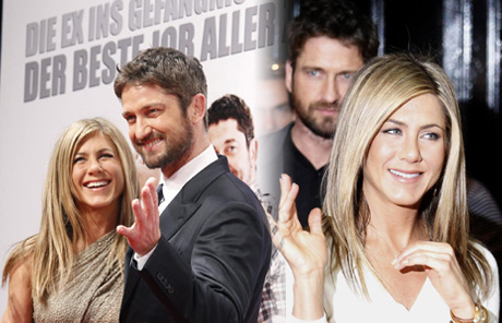 Actors Jennifer Aniston and Gerard Butler pose on the red carpet to promote the movie "Der Kautions-Cop" (The Bounty Hunter) in Berlin, March 29, 2010.