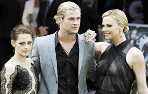 Actors Kristen Stewart, Chris Hemsworth and Charlize Theron attend the world premiere of "Snow White and the Huntsman" at Leicester Square in London May 14, 2012.