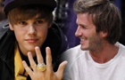 Singer Justin Bieber of Canada chats to soccer player David Beckham during the NBA game between the Los Angeles Lakers and the Houston Rockets in Los Angeles, California, October 26, 2010.
