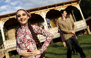Women pose for a picture during a folk festival at an open-air museum in Tbilisi