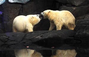Twin polar bear cubs Lele and Jingjing make their debut in a pool in Haichang Polar Ocean World in Wuhan, Hubei province, on Tuesday.