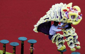 A lion dance group competes on the poles for the title of "South Lion Dance King" in Shenzhen, Guangdong province on March 12, 2012.