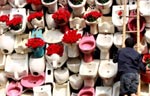 The shape of a heart is made by 6,000 roses in toilet seats hanging on a wall in the city of Foshan, March 24, 2012.