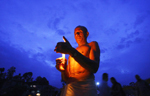A Hindu devotee holds a candle while performing religious rituals on the banks of the Bagmati River while celebrating Kuse Aunse(Father's Day).