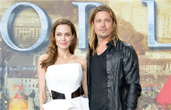 Angelina Jolie poses with her husband Brad Pitt as they arrive for the world premiere of his film World War Z in London June 2, 2013.
