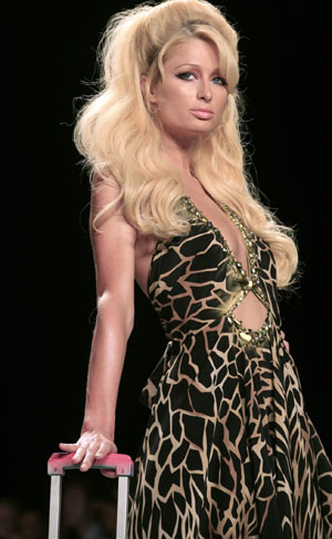 Paris Hilton displays a creation at the Heatherette show during Spring 2007 Fashion Week in New York City September 12, 2006. [Reuters]