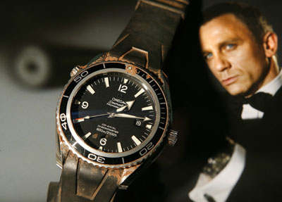 The Omega, 'Seamaster Planet Ocean' watch worn by Daniel Craig during the filming of 'Casino Royale' in 2005/2006, is pictured in front of a promotional photo during a preview at Antiquorum auction house in Geneva April 3, 2007. This watch, which is expected to reach an estimated USD $100,000 during an auction sale in Geneva April 14 and 15, will be one of the highlights with another timepiece worn by Pierce Brosnan during the filming of 'Tomorrow Never Dies' and a second one worn by Daniel Craig during 'Casino Royale'. [Reuters]