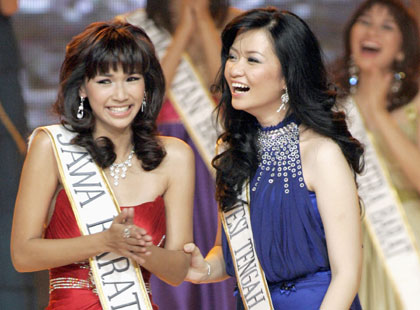 | Winner of the Miss Indonesia beauty contest Kamidia Radisti (L) reacts