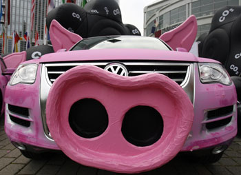 | Greenpeace activists paint a Passat of German car manufacturer Volkswagen pink and drape a swine snout and ears during a protest against air pollution in front of the international car show IAA in Frankfurt September 13, 2007. [Reuters] |