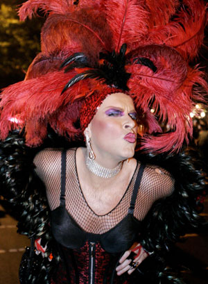 | participant parades down the street before the start of the annual High Heel Drag Race at Dupont Circle in Washington October 30, 2007. The event features drag queens parading in costume before racing down 17th street in the Dupont Circle neighborhood each year on the Tuesday before Halloween. [Agencies] |