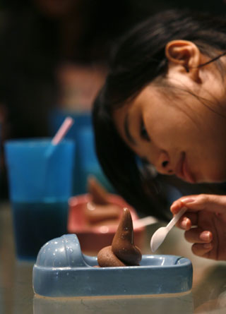 | A customer looks at her ice-cream at the Modern Toilet diner in the Shilin district in Taipei November 9, 2007. All 100 seats in the crowded diner are made from toilet bowls, not chairs. Sink faucets and gender-coded "WC" signs appear throughout the three-storey facility, one of 12 in an island-wide chain of eateries with a toilet theme. Picture taken November 9, 2007.[Agencies] |
