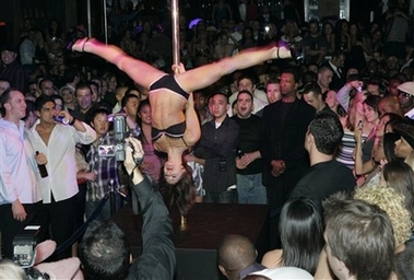 Pole dancer Anika, center, performs during the third semi-annual 'Pole-A-Palooza' pole dance competition at JET nightclub at the Mirage Hotel and Casino in Las Vegas, Tuesday, Nov. 20, 2007. Anika won the competition. [Agencies]