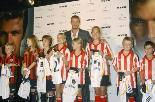 Former England soccer captain David Beckham poses with young socceroos during a promotional event to launch his new fragrance "Intimately Beckham Night" in Sydney November 28, 2007. [Agencies]