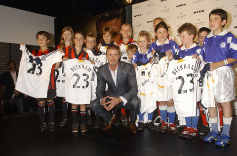Former England soccer captain David Beckham poses with young socceroos during a promotional event to launch his new fragrance "Intimately Beckham Night" in Sydney November 28, 2007. [Agencies]