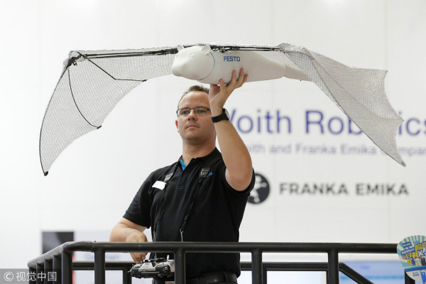 Softly whirring robotic arms five meters tall lifts up a car weighing nearly two tons and moves it around in the air, as a crowd of visitors below hold up their phones to record and take pictures.
