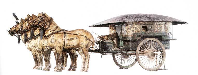 A Qin bronze chariot was discovered in the eastern part of Emperor Qin’s tomb in 1980. They were painted with colors, and were vividly produced. The replicas can supply the demand of foreign visitors, and enrich our art treasury.