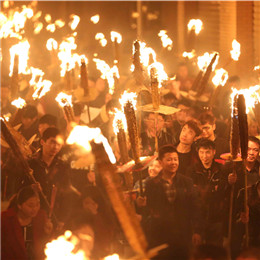 Residents in Shanqian village, Jinjiang city, East China's Fujian province, hold torches while touring the village in a traditional ritual to wish happiness in the Chinese Lunar New Year, on Feb 16, 2016.