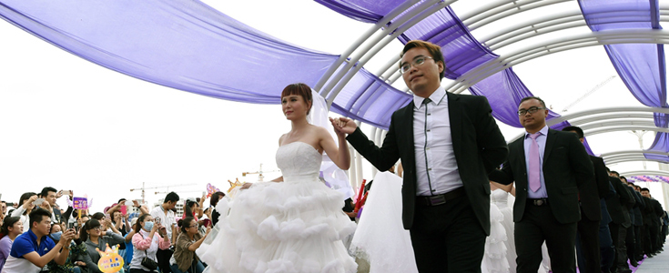 There was a group wedding ceremony for 46 new couples and 6 golden and silver couples from across the country amidst a sea of lavender blossoms in the city of Jinchang, Gansu province.