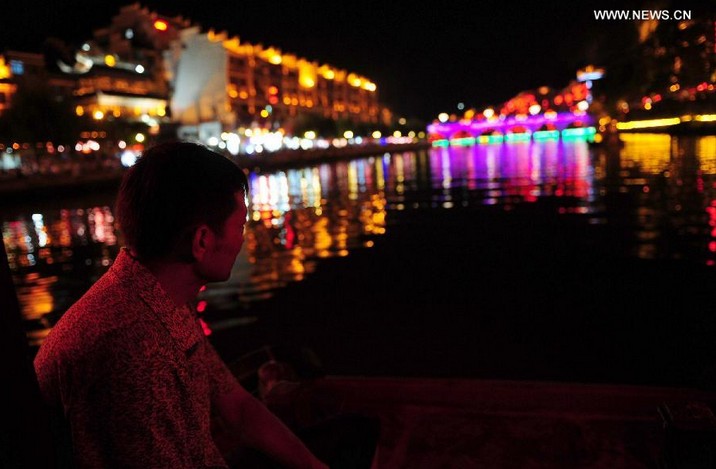 A tourist enjoys the night scenery of Zhenyuan Ancient Town in southwest China's Guizhou Province, Aug. 5, 2013. Known as "Oriental Venice", Zhenyuan Ancient Town witnessed a tourism peak this summer. (Xinhua/Liu Xu)