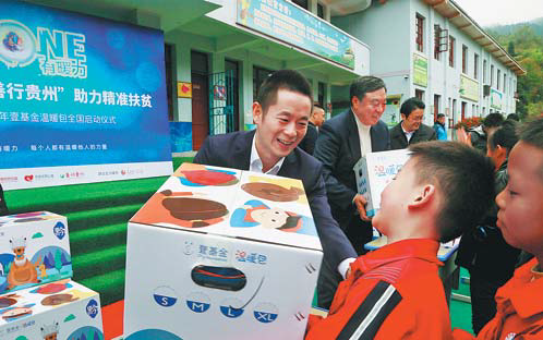 Students at a primary school in Guiyang, Guizhou province, receive Warm Bags, which contain a variety of daily necessities, such as winter coats, snow boots and hats, from One Foundation, a Chinese private charitable fundraising organization.