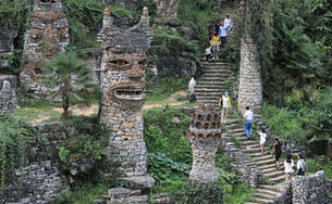 Song Peilun introduces the inspiration of his stone castle "Yelang" in Leping village of Huaxi district in Guiyang, Southwest China's Guizhou province, July 1, 2018.