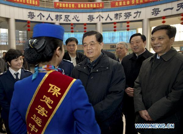Chinese President Hu Jintao (4th R) talks with a staff member as he visits a long-distance coach station in Baoding City, north China's Hebei Province, Feb. 1, 2011.  [Photo/Xinhua]