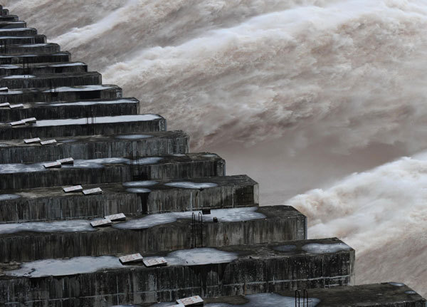 Floodwater rushes through the sluice gates of the Three Gorges Dam in Yichang, Central China's Hubei province on July 20, 2010. [Photo/Xinhua]