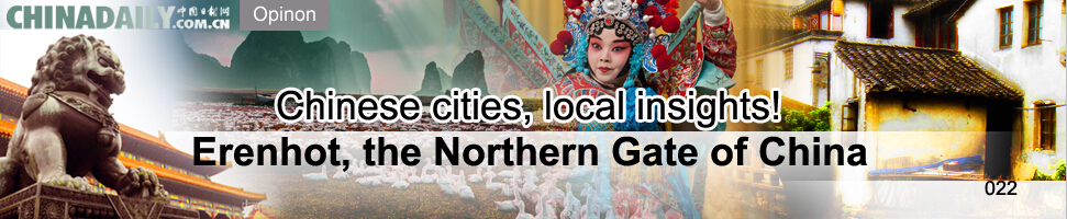 The gateway of Erenhot, honored as "the Northern Gate of China", is in the military area of the northen Erlian city, covering an area of 1.3 millionsquare meters, and its most northern point is near the border between China and Mongolia. When we stand on the gateway, looking towards the north, we can see the exotic scenery, such as the Mongolian border town Zamin-Uued and groups of Mongolian yurt. Sweeping from east to west, we can appreciate a boundless prairie, relaxed and happy. Looking towards the south, we can catch aglimpse of the beauty of Erenhot city. The train tracks, under the gateway, are road traffic arteries, connecting Ulan Bator, Moscow and Beijing, honored as the "Eurasia Land Bridge".
