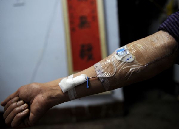 Zheng Anhong, a 58-year-old fruit vender who is suffering from colon cancer, shows syringe fixed on his arm at his home in Anshan City of northeast China's Liaoning Province, May 17, 2010. (Xinhua/Li Gang)