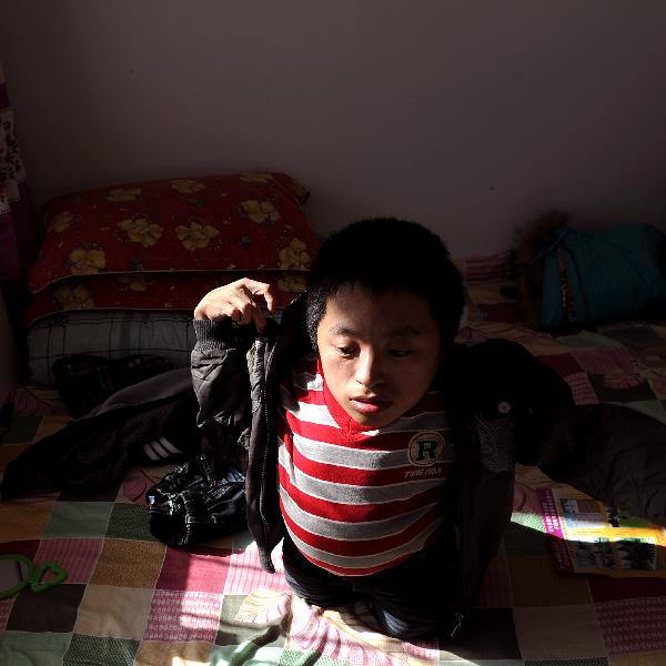 Dong Zhijun dresses himself in Tai'an, northeast China's Liaoning Province before going out, insisting that he can be helped with everything but self-dressing, Oct. 25, 2010. (Xinhua/Yao Jianfeng)