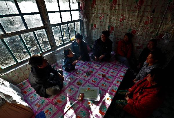Dong Zhijun (2nd L) talks about the future of his plantation with his relatives in Tai'an, northeast China's Liaoning Province, Oct. 25, 2010. (Xinhua/Yao Jianfeng)