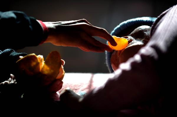 Dong Zhijun feeds his fiancé Yuan Wanyu (R) with orange as Wanyu, feeling uncomfortable in the eyes, lies in bed for a rest in Tai'an, northeast China's Liaoning Province, Oct. 26, 2010. (Xinhua/Yao Jianfeng)