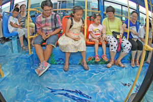 Six buses decorated with ocean-themed 3D paintings debuted in Yantai, East China’s Shandong province on Aug 23, 2015.