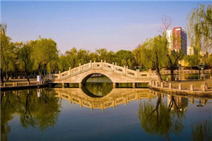 A stone arch bridge with its shadow in the water forms a picturesque scene in Minghu Park in Tai'an, Shandong province.