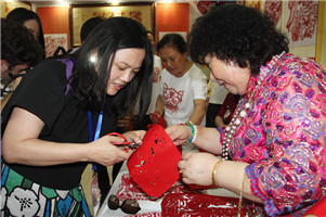The Chinese paper-cutting artist, Zhu Manhua, met with a group of journalists from South Korea on June 25, at her paper-cutting art museum, to give a demonstration of the unique Chinese craft.