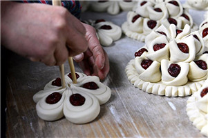 Villager Yuan Xiaorong makes traditional steamed jujube bread in Liaocheng city, Jan 28.