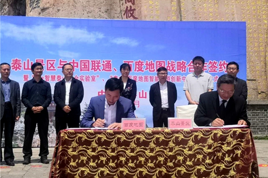 The Mount Tai Scenic Area in Shandong province's Tai'an city signed strategic cooperation framework agreements with China Unicom and Baidu Map respectively on May 14 to jointly work on smart tourism solutions and boost the development of all-for-one tourism.