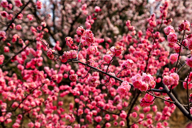 With the weather warming up, plum trees are entering peak flower stage in the Mount Tai Scenic Area in Tai'an, East China's Shandong province, attracting hordes of visitors to admire the flowers and enjoy the vibrant spring scene.