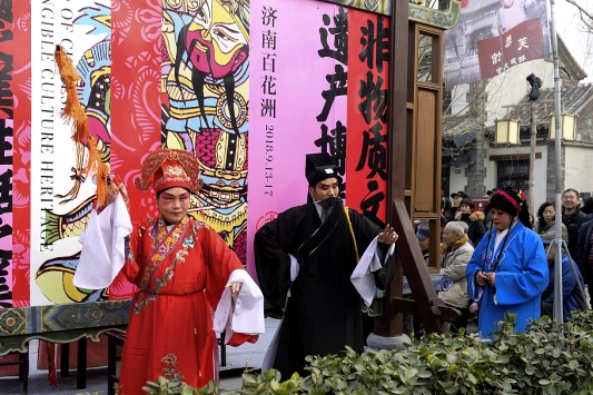 Local residents and visitors were entertained to a traditional drama show staged in the historical and cultural district of Mingfucheng, Jinan, East China's Shandong province on Feb 27.