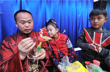 Folk artist Du Yifang demonstrates rooster dolls she made in Dong'er village of Tancheng county, East China's Shandong province, Jan 15.