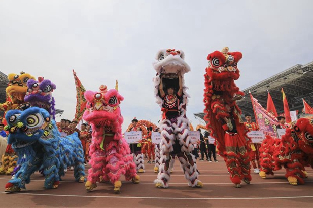 People perform lion dance during a dragon and lion dance competition at Linyi University in Linyi, East China's Shandong province.