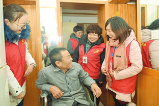 Children from Bingdong Primary School chose post-it notes from a board containing the wishes and needs of senior residents at Bingsan community on Qiaodong Street, Taiyuan city, Feb 2.