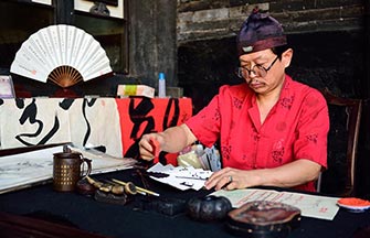 While on an after-dinner stroll in Wutai county, I entered an art and crafts shop containing beautiful Buddhist paintings (thangkas) where a group of Chinese were having a tea ceremony around a large table.