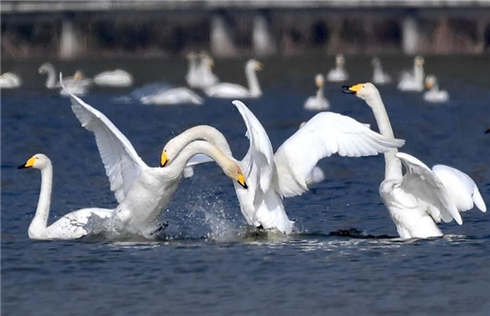Whooper swans fly at the wetland of Yellow River in Pinglu county, North China's Shanxi province, Nov 2, 2017. Many whooper swans came to spend the winter time in the wetland every year.