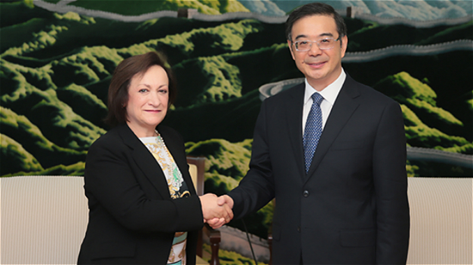 Zhou Qiang, president of China’s top court, met with Attorney General Joana Marques Vidal of Portugal on April 21, 2016 in Beijing.