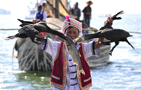A Chinese Bai ethnic minority fisherman pulls two cormorants away from a fish during Erhai lake fishing opening festival in Dali, Yunnan province September 28, 2011. The cormorants are domesticated for fishing.