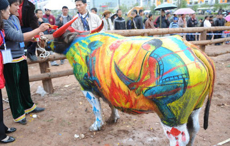 An International Buffalo Body Painting Contest was held in Jiangcheng, Yunnan province on Dec 10, 2011. It drew 48 teams from 10 different countries.