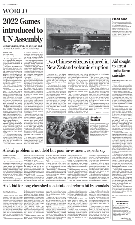 WELLINGTON-Two Chinese citizens were among 47 people on New Zealand's White Island when a volcano erupted on Monday, New Zealand police said on Tuesday. Their names haven't yet been released.