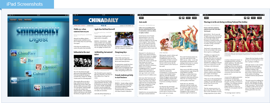 產品薈萃《中國日報》及其網站有關中國的深度報道、特寫與分析,以及言論板塊精華,為用戶深入了解中國提供了一個廣度與縱深兼備的途徑。它是即時新聞產品的補充和拓展。