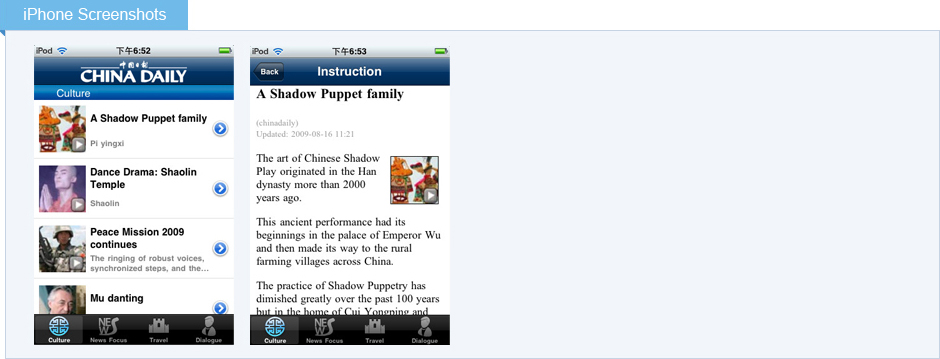 產(chǎn)品以獨(dú)家原創(chuàng)視頻內(nèi)容架設(shè)起外部世界了解中國(guó)的橋梁,它以國(guó)際化的視角娓娓講述不為人所熟知的中國(guó)故事,透視中國(guó)的熱門話題,生動(dòng)逼真地展現(xiàn)一個(gè)活生生的中國(guó)。內(nèi)容主要包括名人采訪、熱點(diǎn)新聞事件、文化遺產(chǎn)和自然奇跡。 |